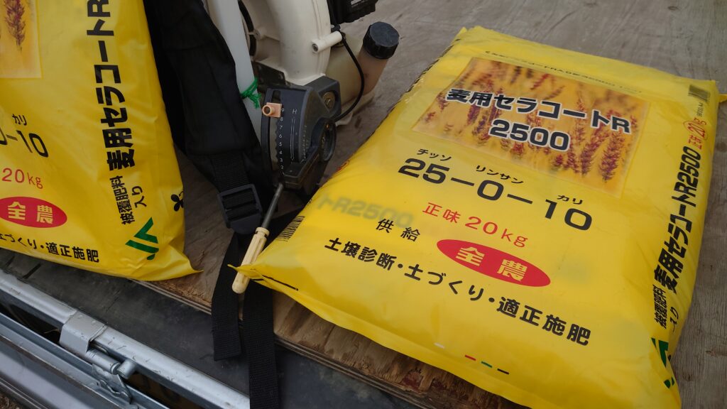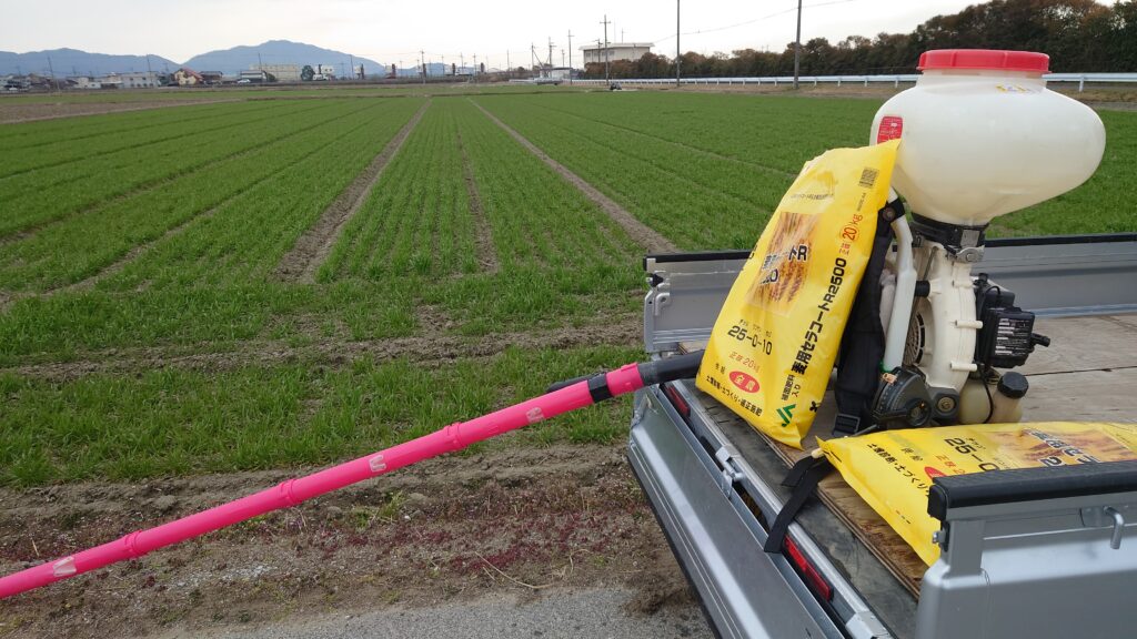小麦に追肥を散布しました 投稿日: 2026年2月24日2026年2月24日 投稿者: hiroshi みなさんこん^^ 2月中、下旬は小麦に追肥をやる時期です。 例年より少し遅くなったのですが、 20日に動噴で肥料を散布しました。 この圃場はきれいに生育しているのですが 切り株がきれいに好きこまれていない圃場は 生育にばらつきがあります。 去年からGPS付きのトラクターを購入しましたので きれいに真っ直ぐ播種できていますね^^